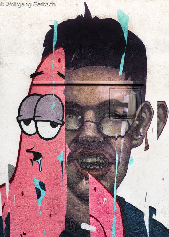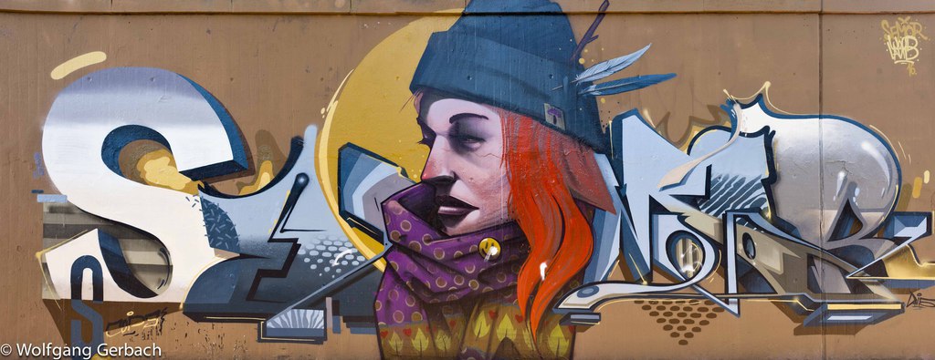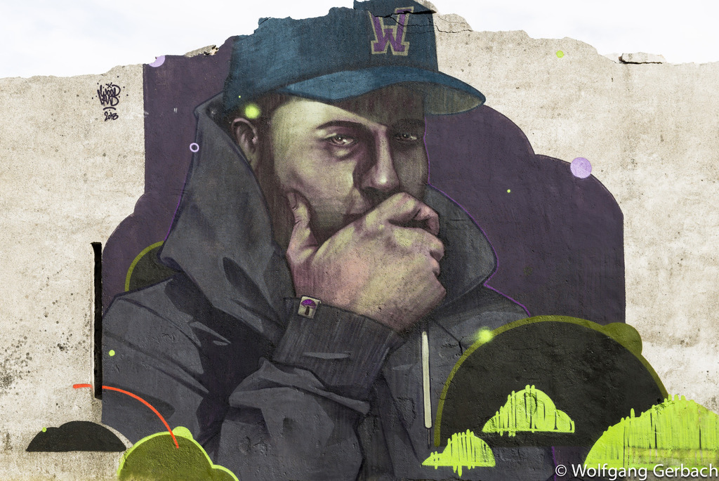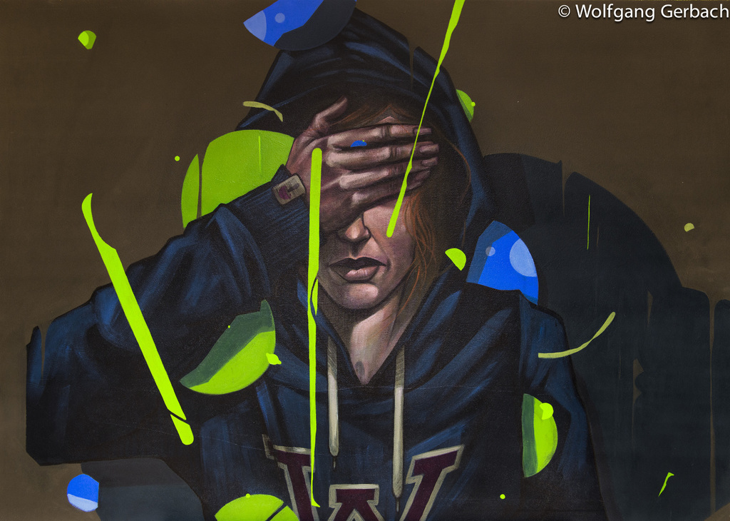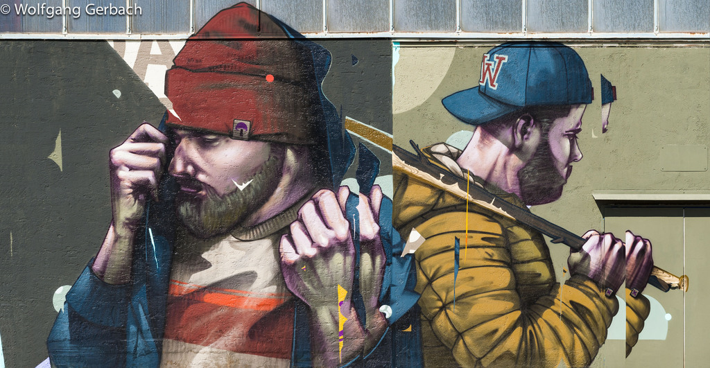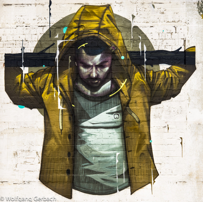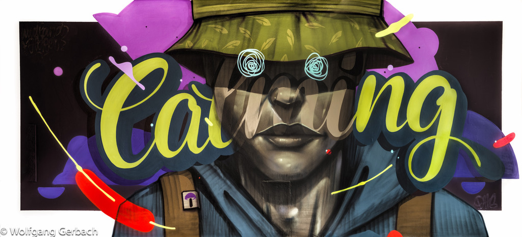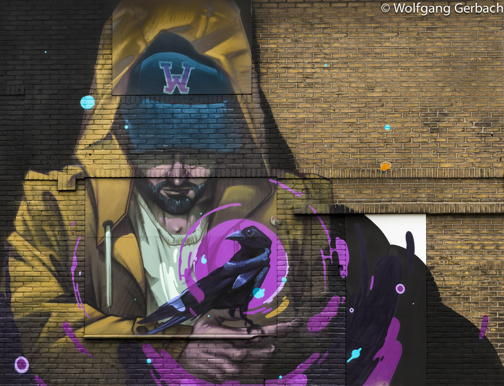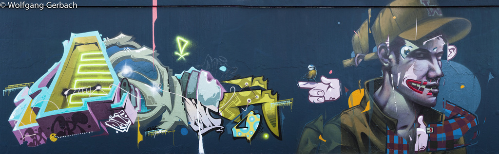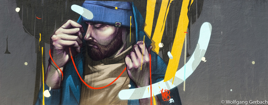Zudem erweitert er ständig sein Repertoire und hat sich jetzt auf die Darstellung von Personen spezialisiert; in dunklen Tönen und 3D-Graffikelementen.