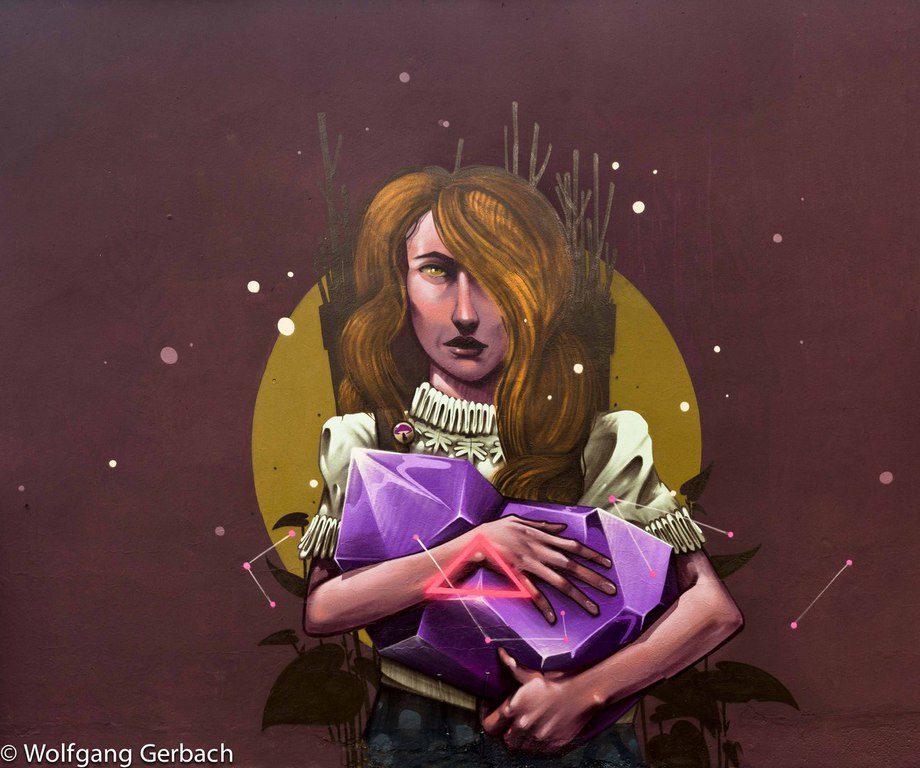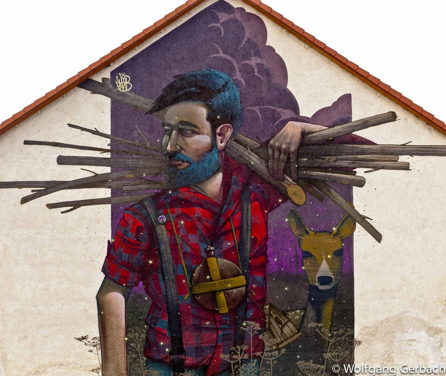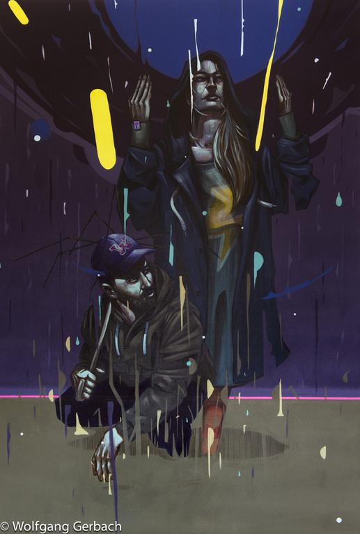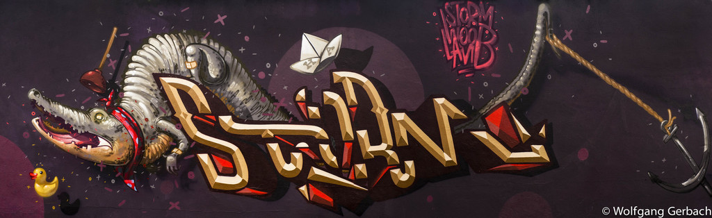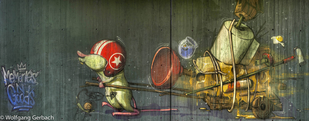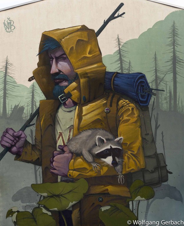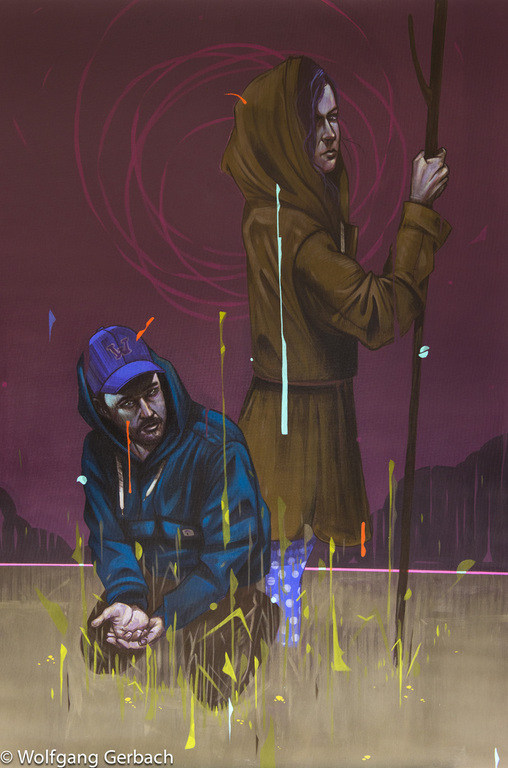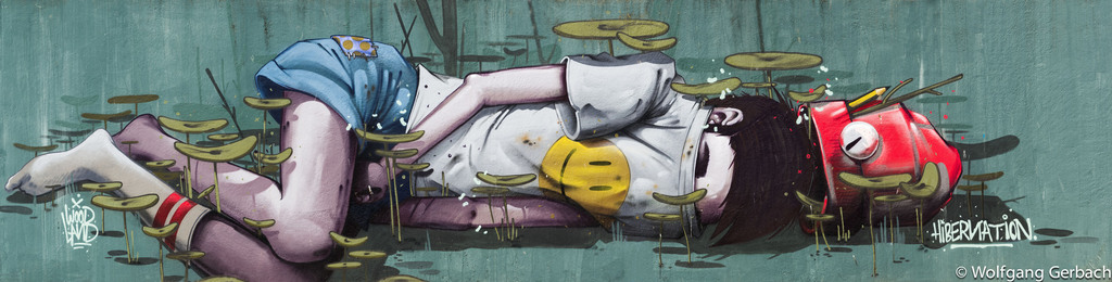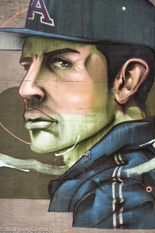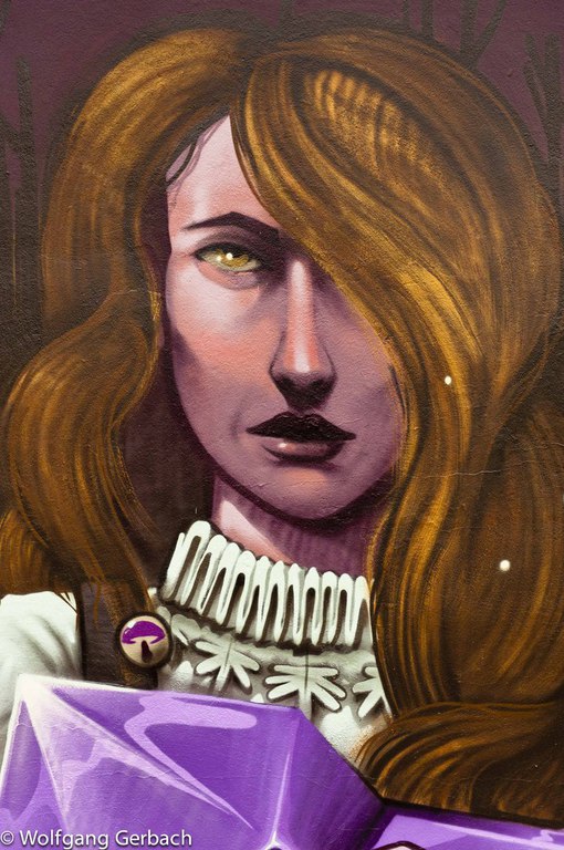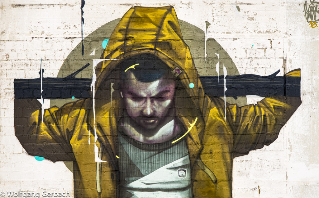 Zudem erweitert er ständig sein Repertoire und hat sich jetzt auf die Darstellung von Personen spezialisiert; in dunklen Tönen und 3D-Graffikelementen.