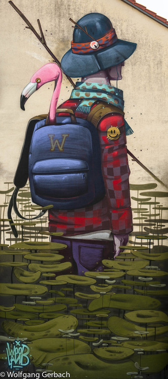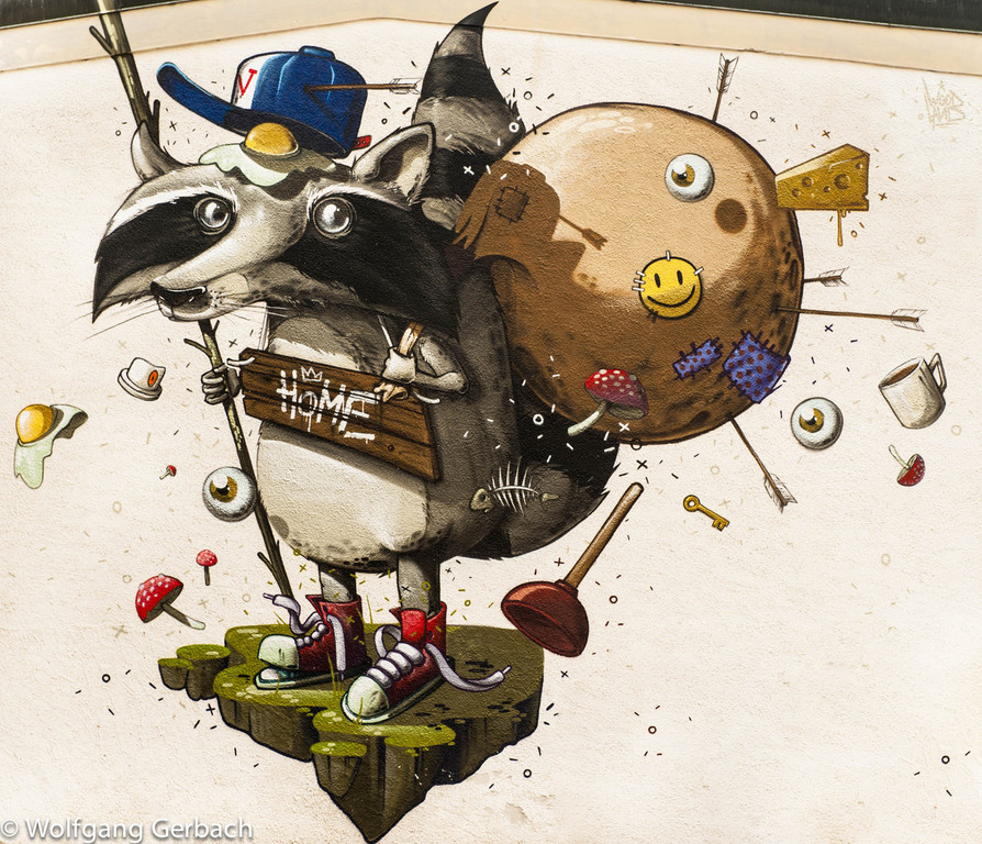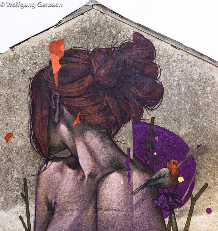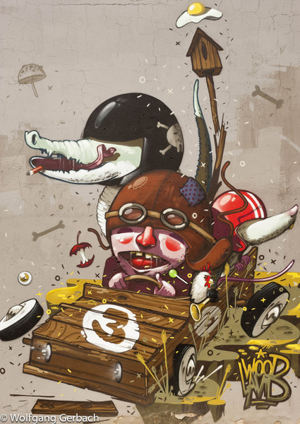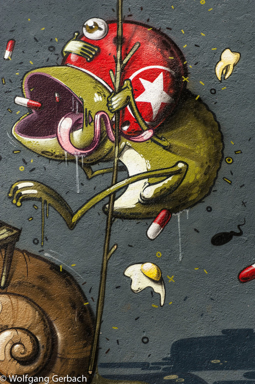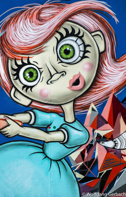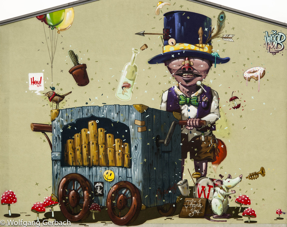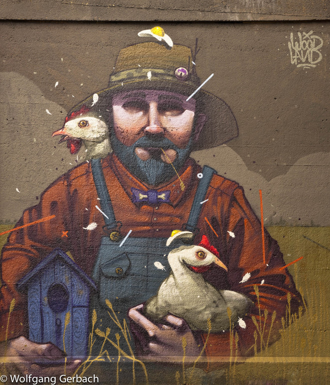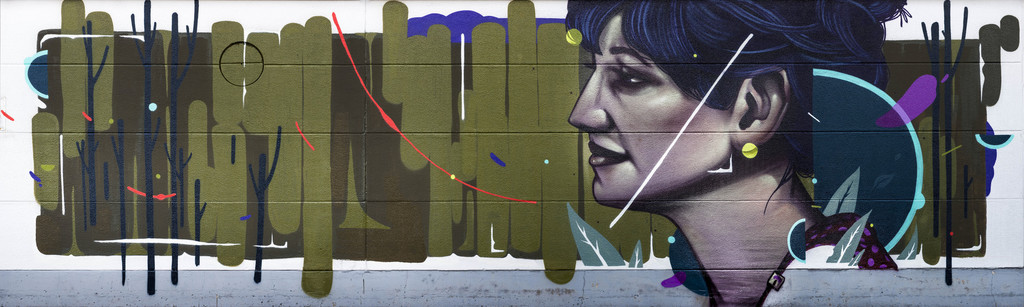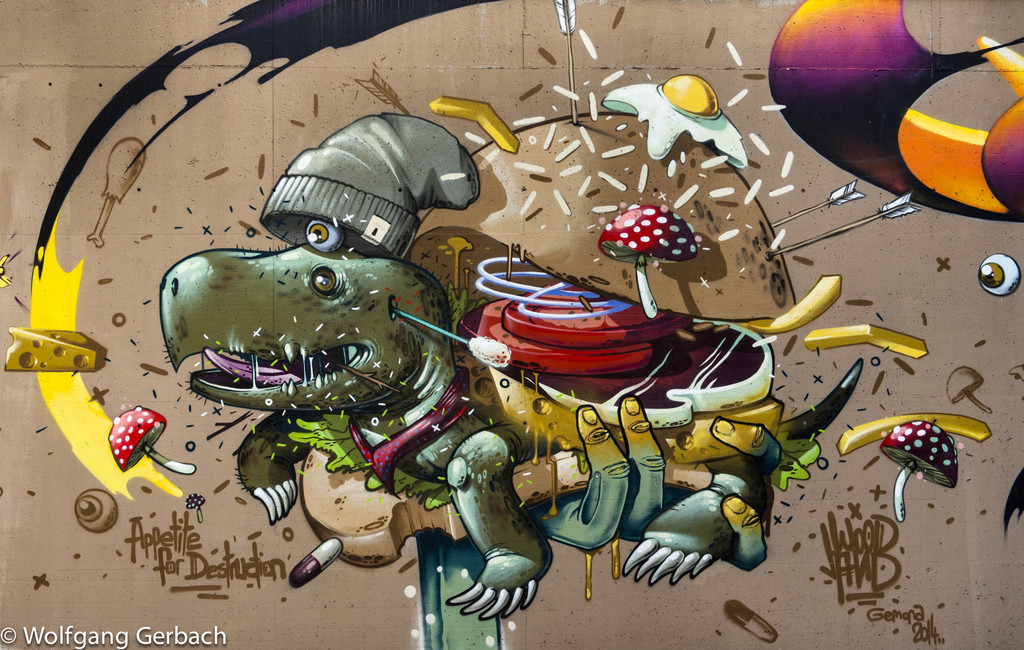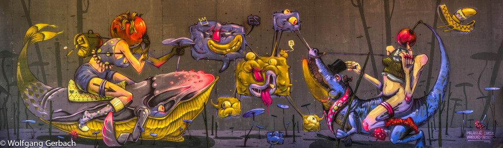 Zudem erweitert er ständig sein Repertoire und hat sich jetzt auf die Darstellung von Personen spezialisiert; in dunklen Tönen und 3D-Graffikelementen.