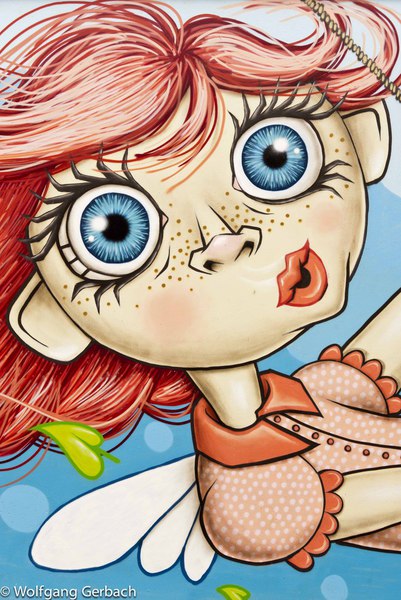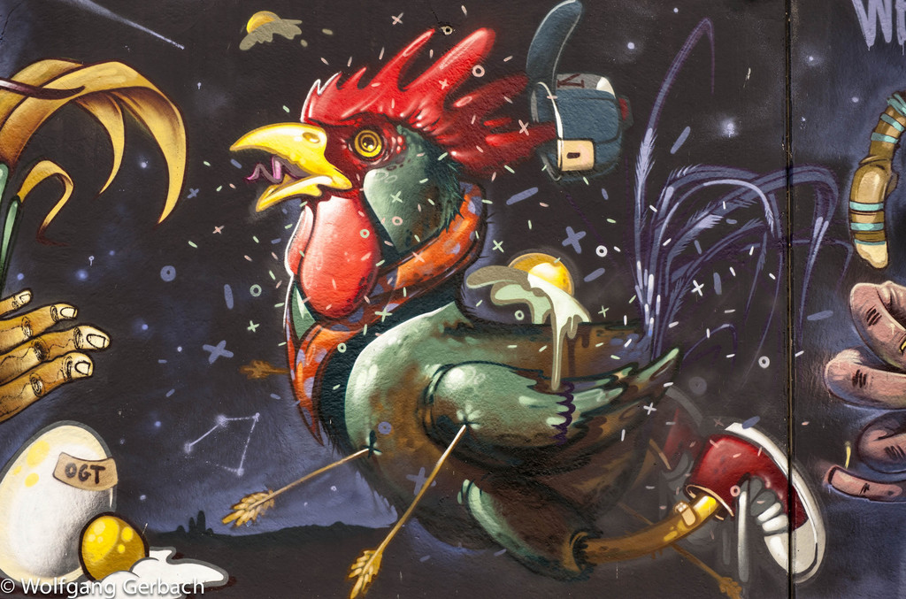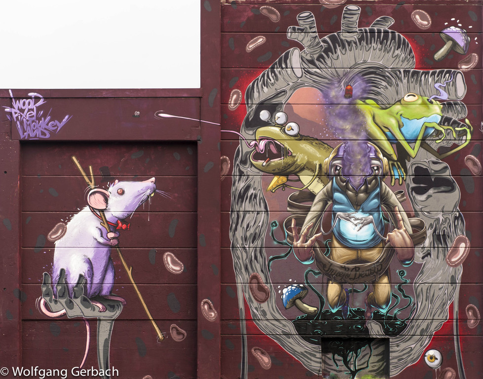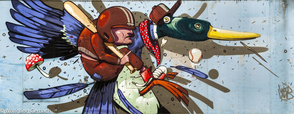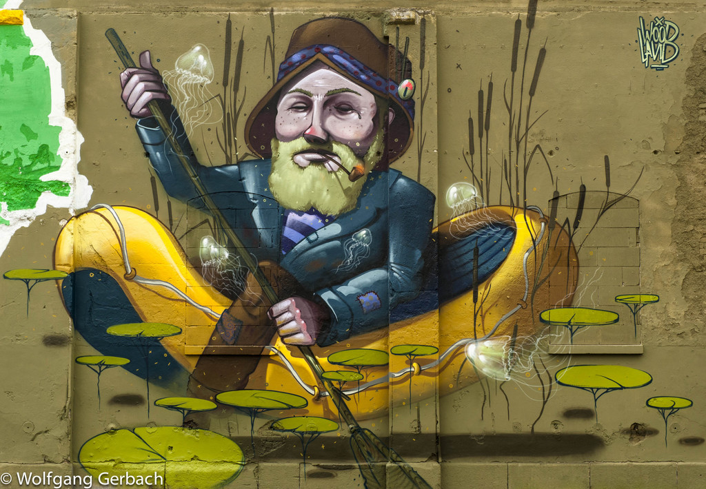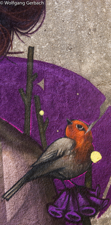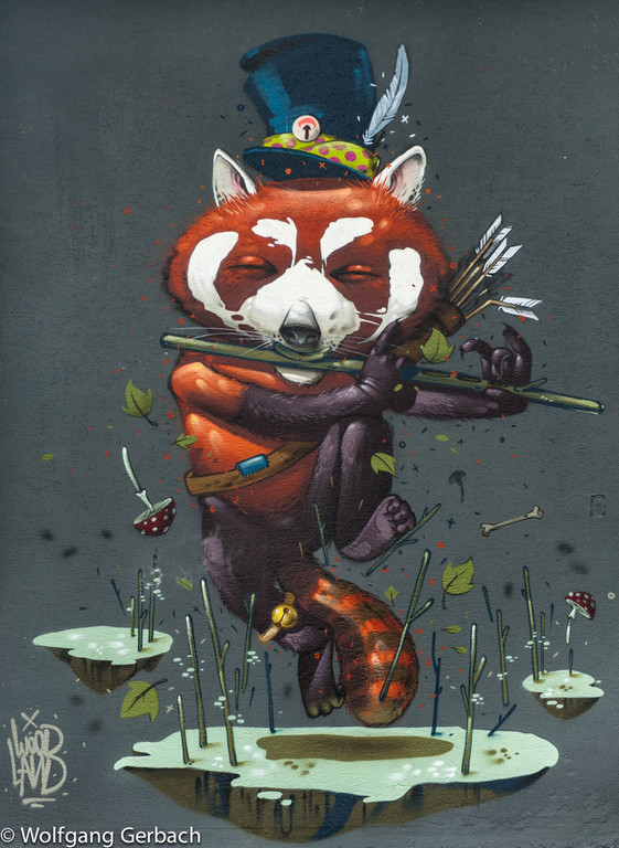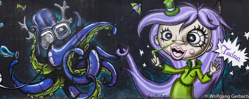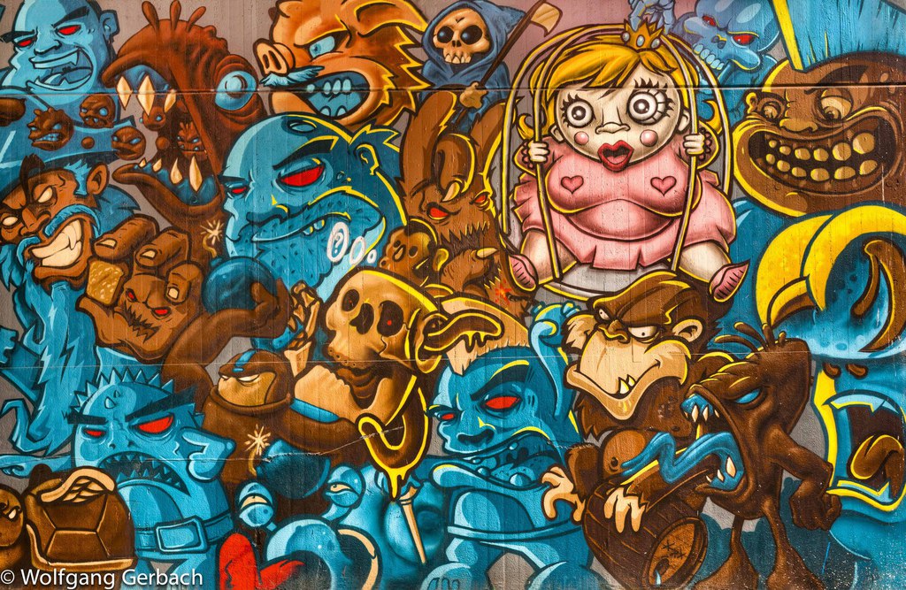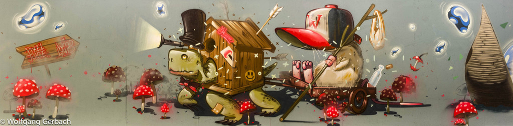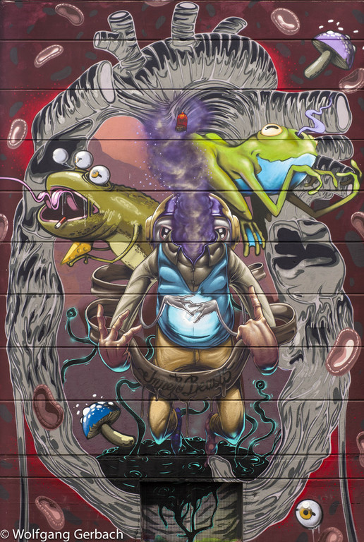 Zudem erweitert er ständig sein Repertoire und hat sich jetzt auf die Darstellung von Personen spezialisiert; in dunklen Tönen und 3D-Graffikelementen.