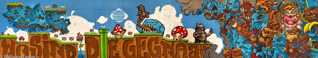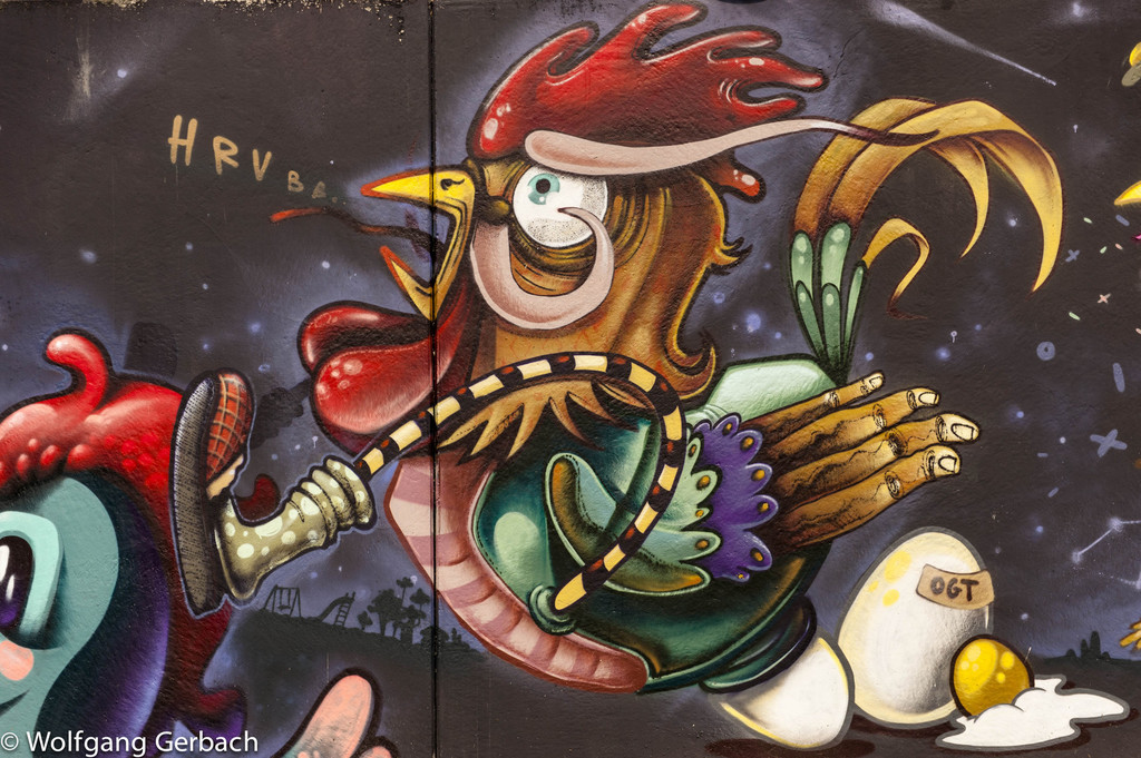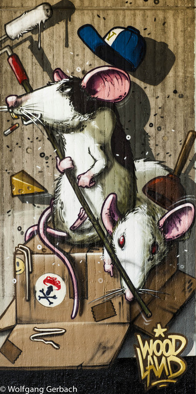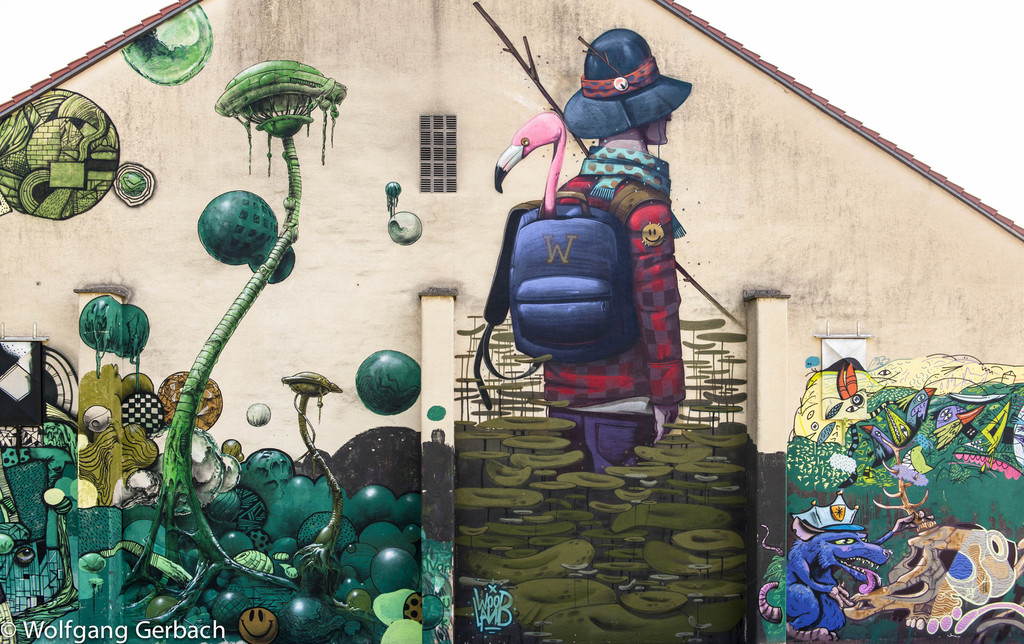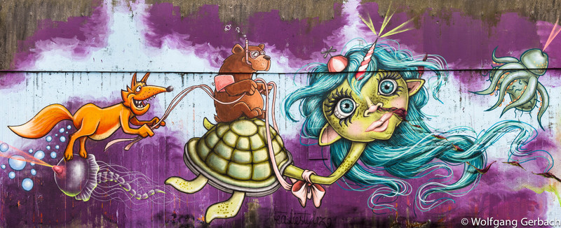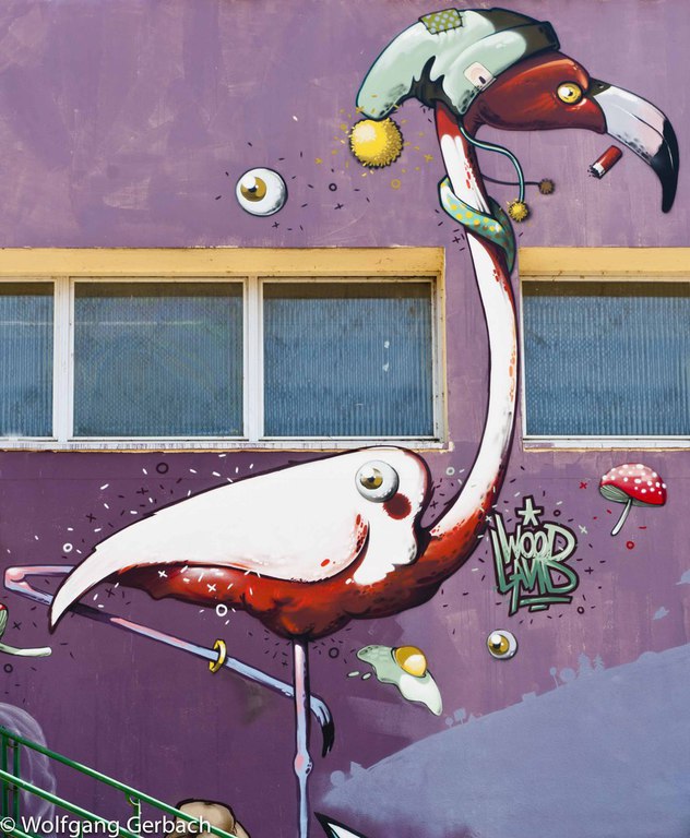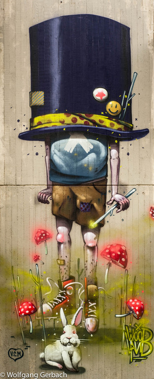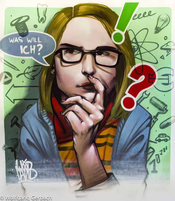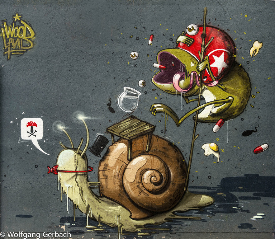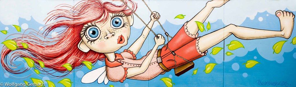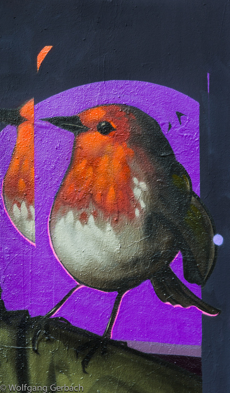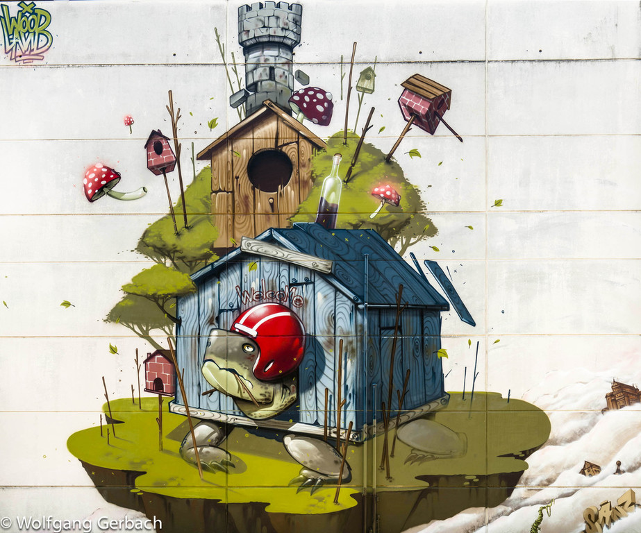 Zudem erweitert er ständig sein Repertoire und hat sich jetzt auf die Darstellung von Personen spezialisiert; in dunklen Tönen und 3D-Graffikelementen.