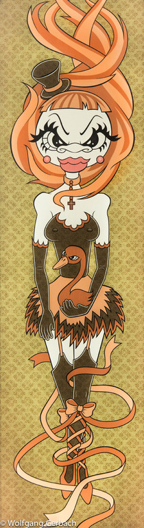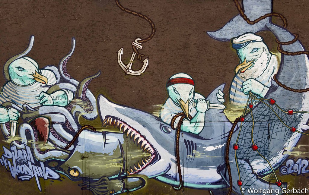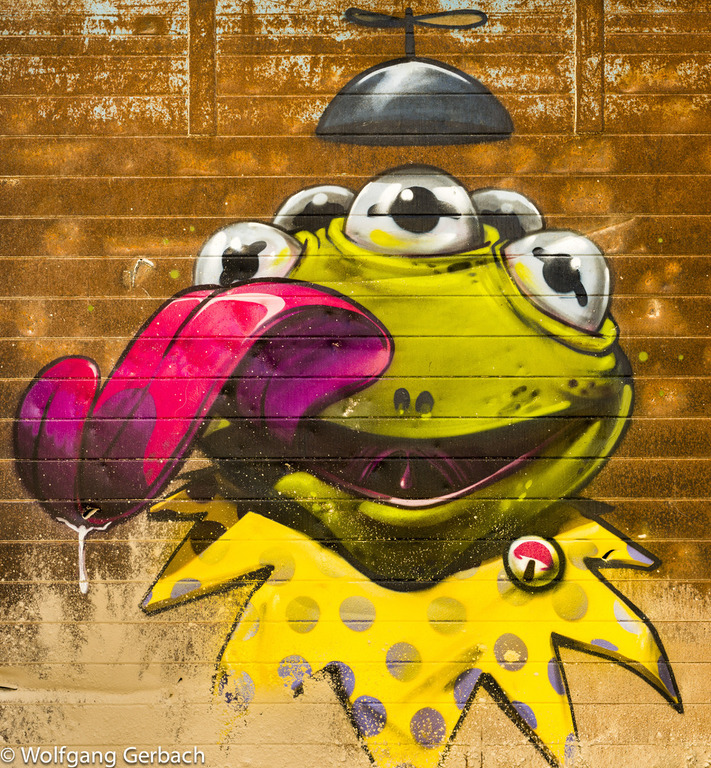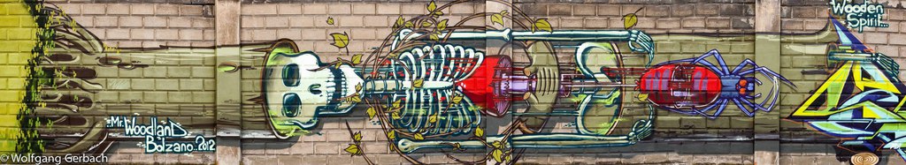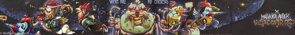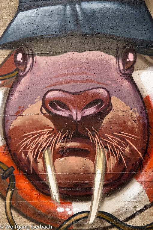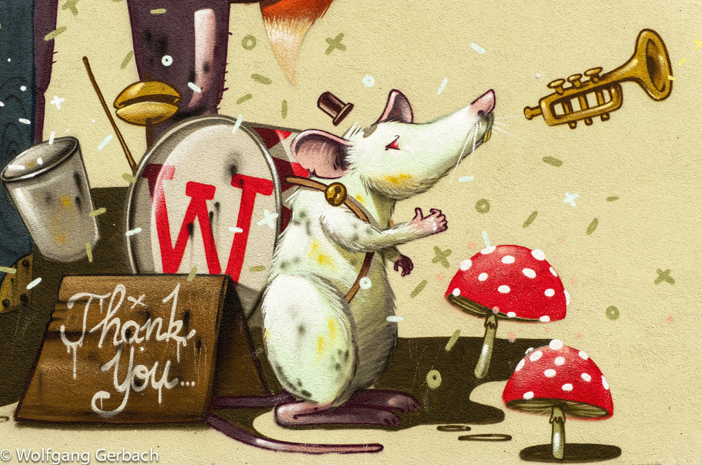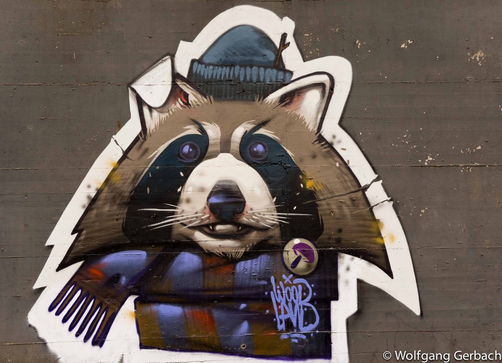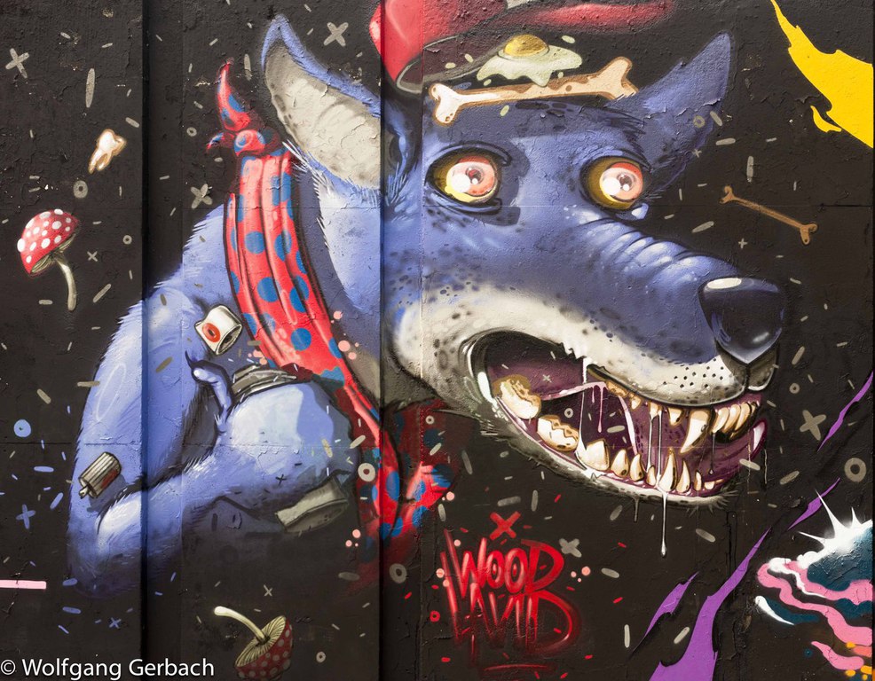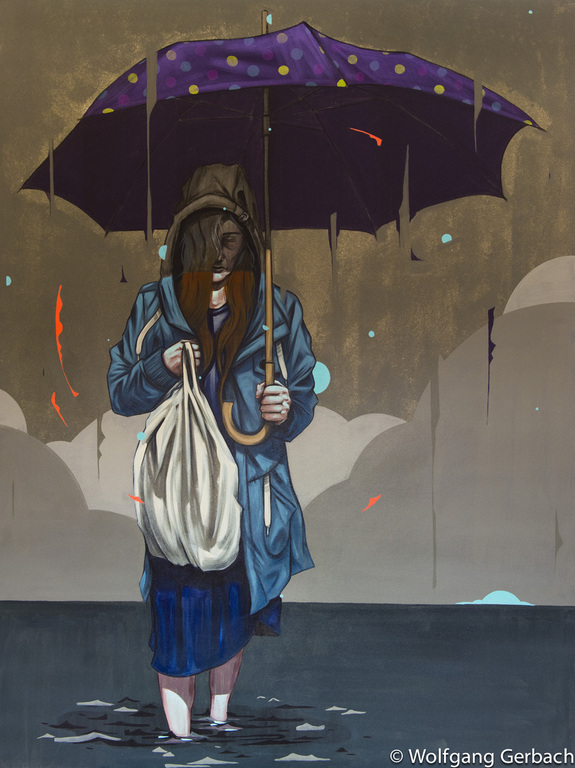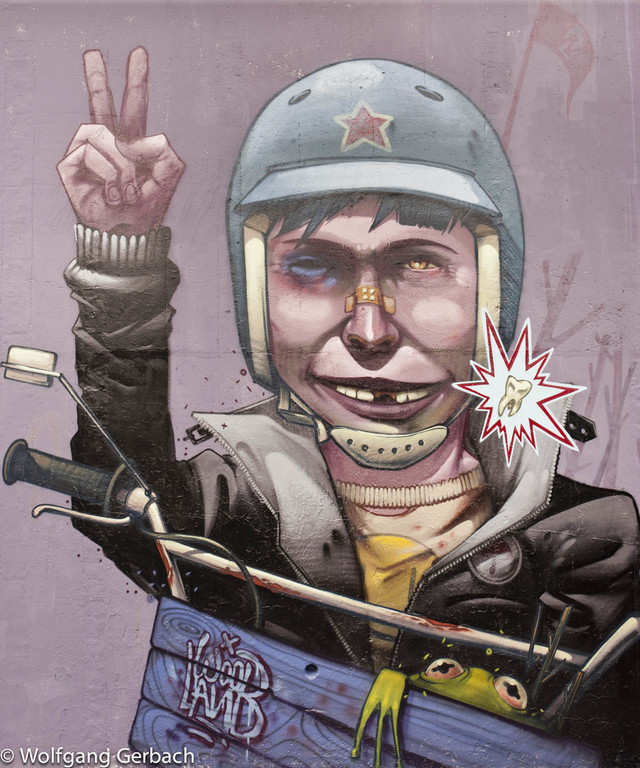 Zudem erweitert er ständig sein Repertoire und hat sich jetzt auf die Darstellung von Personen spezialisiert; in dunklen Tönen und 3D-Graffikelementen.